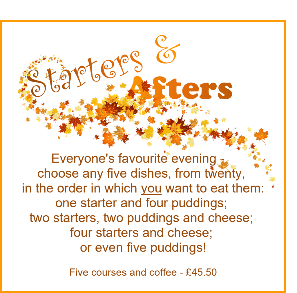 Starters and Afters is completely different, with ten starters and ten desserts to choose from, guests order five dishes in whatever order they like: 3 starters and 2 desserts; 2 starters, 2 desserts and cheese; 4 starters and cheese; and so on. It is so popular with our fans that we have had to schedule it four times a year.